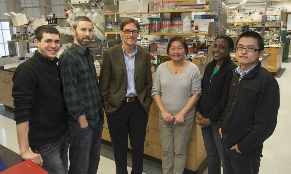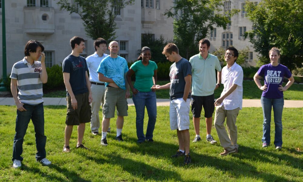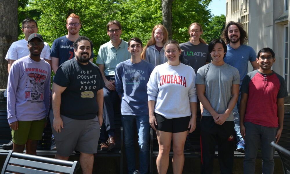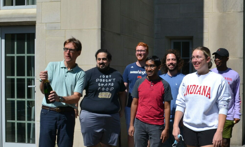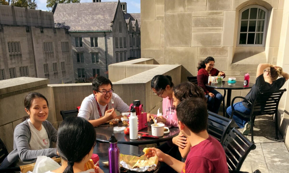 Members of the Giedroc group eating lunch on the 3rd floor balcony of Simon Hall (Fall 2017)